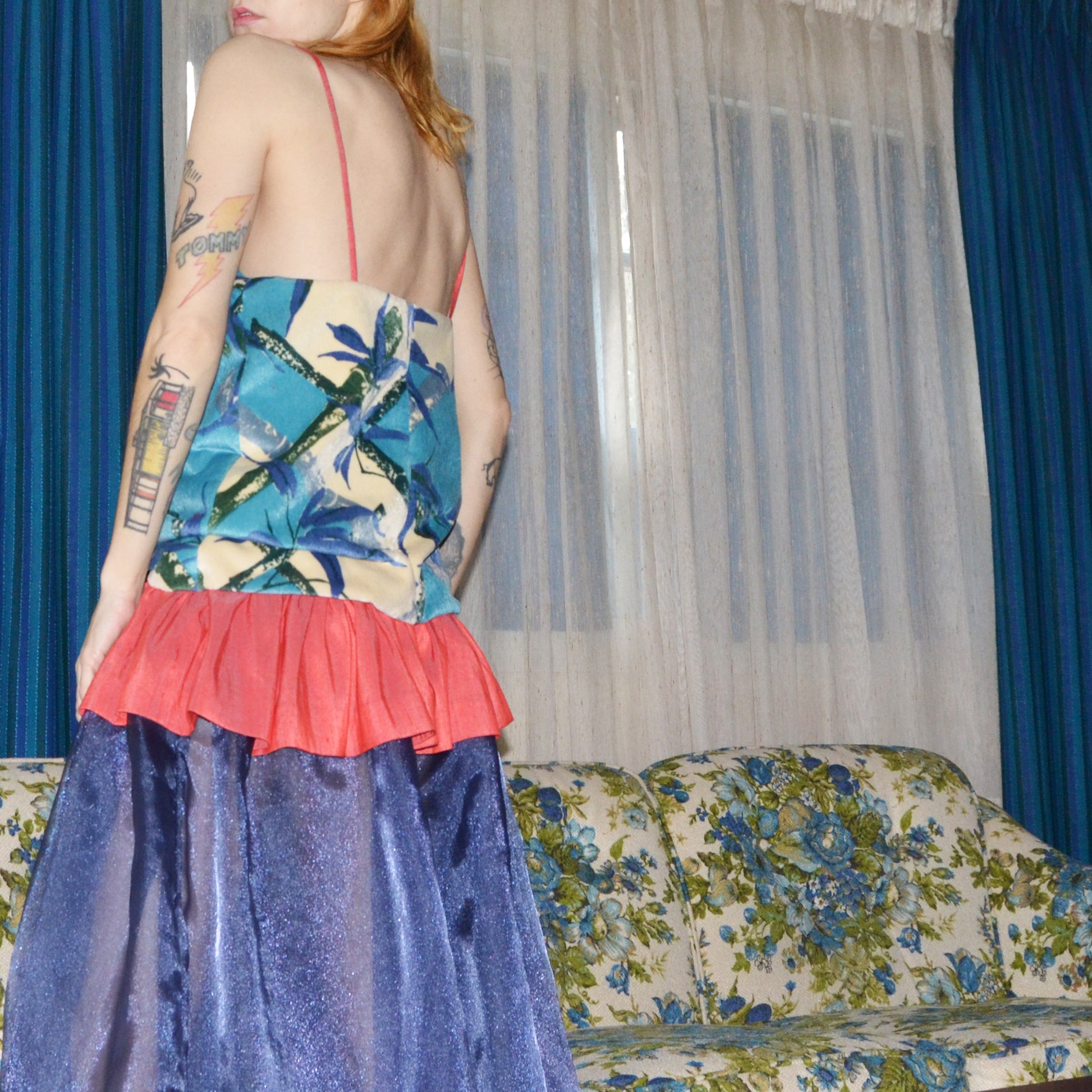 Slouchy upholstery print velvet bodice circa mid-1970s layered over midcentury melon silk taffeta and navy chiffon. Lined. Back zipper.