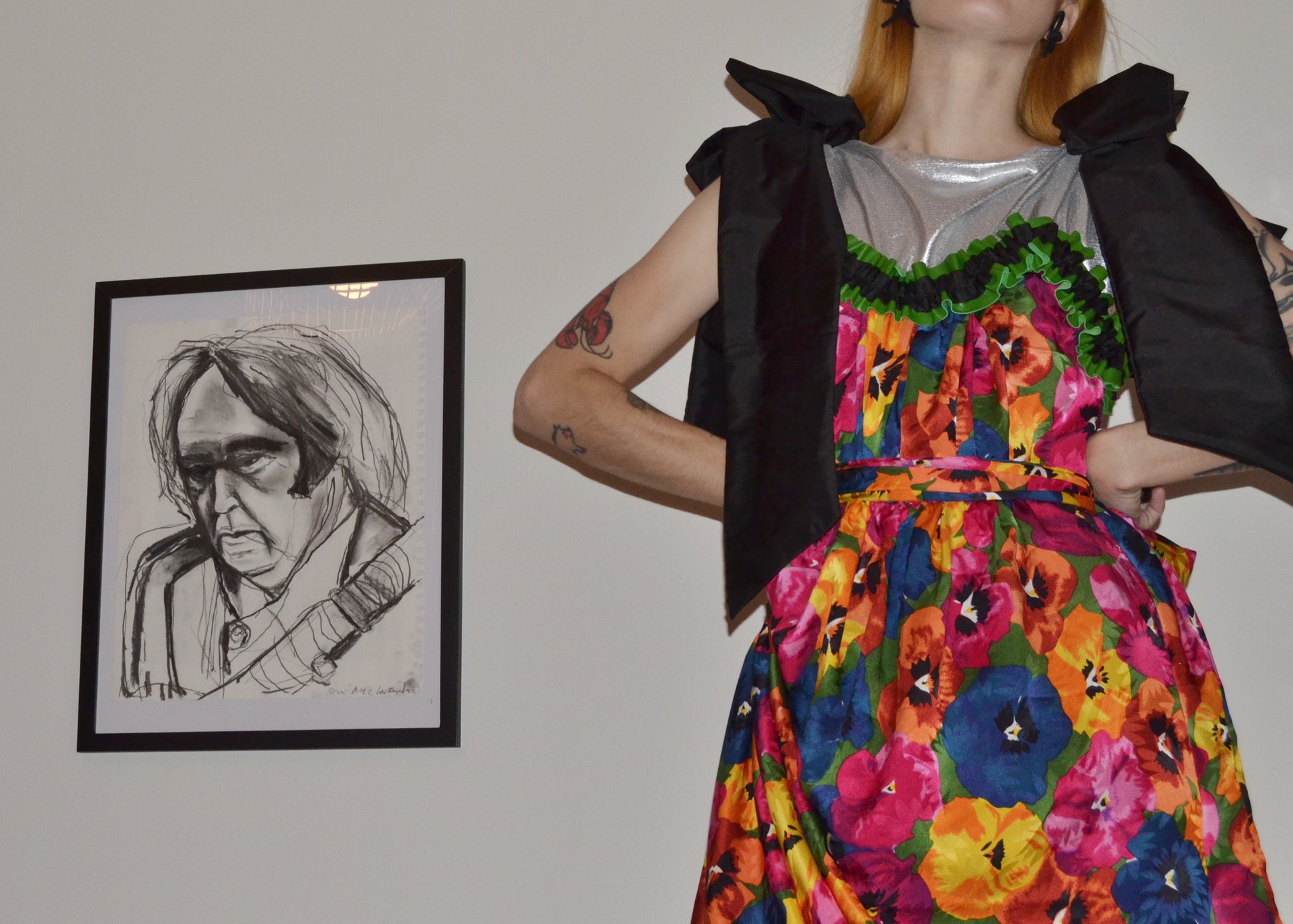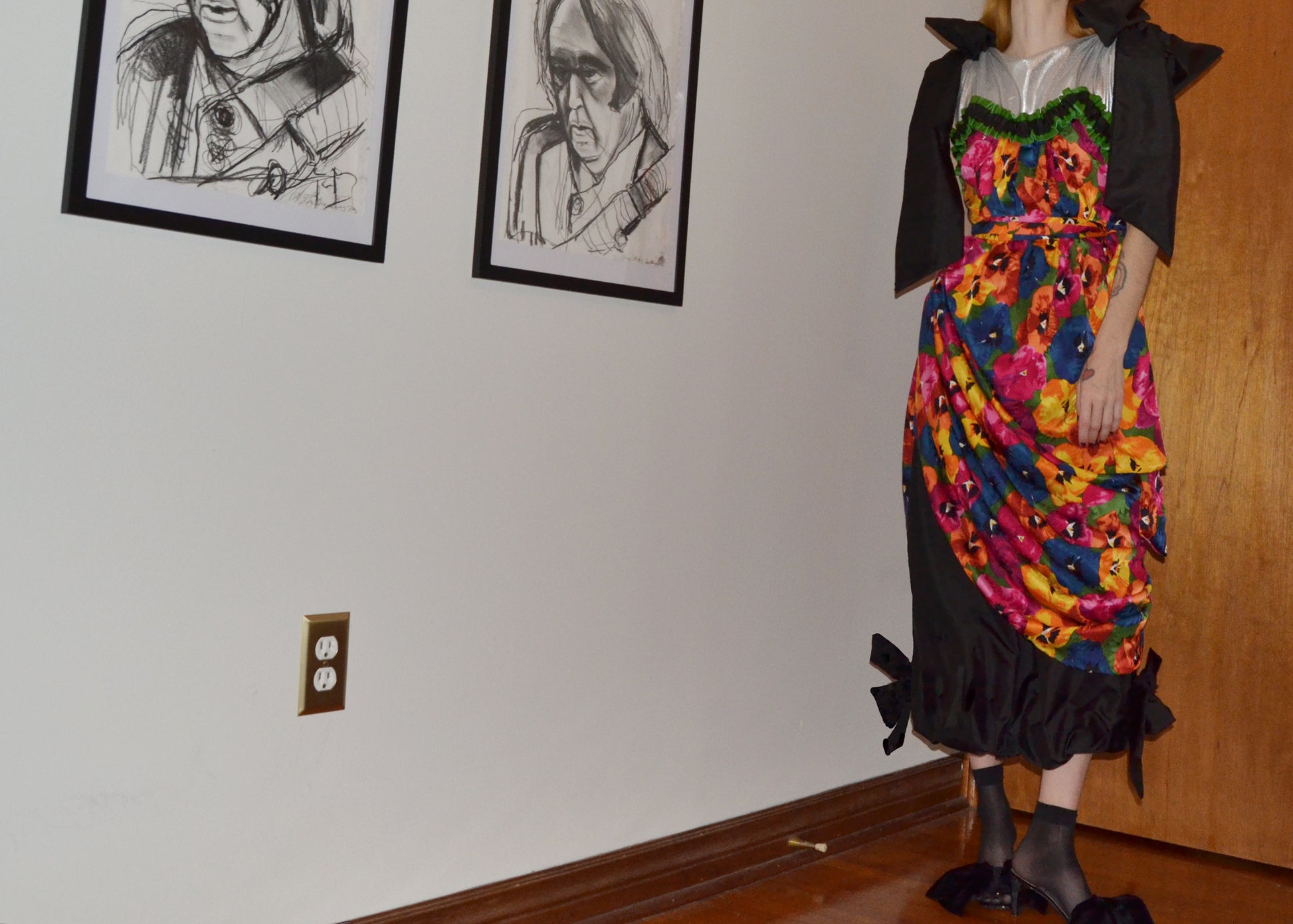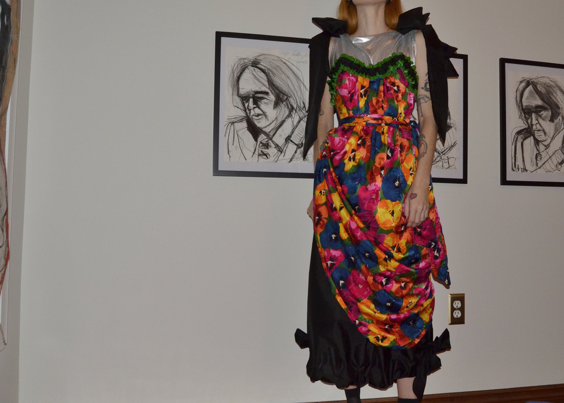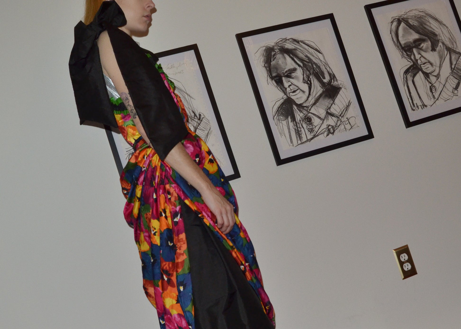 Floral silk chiffon draped asymmetrically over gathered black silk taffeta. Yoke is trimmed in green leather. Bows at shoulder at hem. Side zipper.